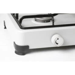 Fornello gas a 2 fuochi stabile e compatto, dotato di coperchio.