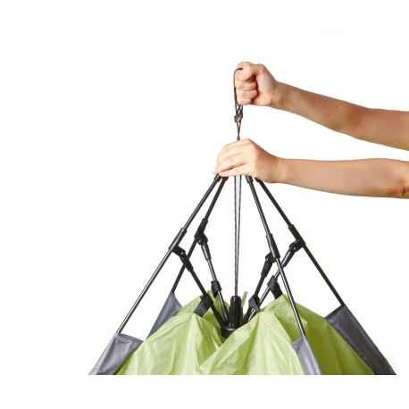 Tenda automatica a cupola con doppio tetto e comoda abside. Grazie alla moderna struttura con tecnologia di trazione a fune integrata, può essere montana e pronta all’uso in pochi secondi.